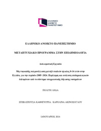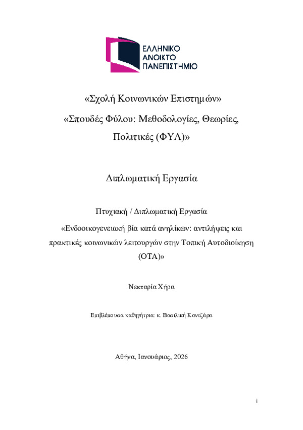 Περίληψη (Abstract): Η παρούσα μεταπτυχιακή διπλωματική εργασία με τίτλο «Ενδοοικογενειακή βία κατά ανηλίκων: αντιλήψεις και πρακτικές κοινωνικών λειτουργών στην Τοπική Αυτοδιοίκηση (ΟΤΑ)» έχει ως σκοπό τη διερεύνηση των αντιλήψεων, των επαγγελματικών πρακτικών και των εμπειριών των κοινωνικών λειτουργών που εργάζονται στις κοινωνικές υπηρεσίες των δήμων, αναφορικά με τη διαχείριση περιστατικών ενδοοικογενειακής βίας ...