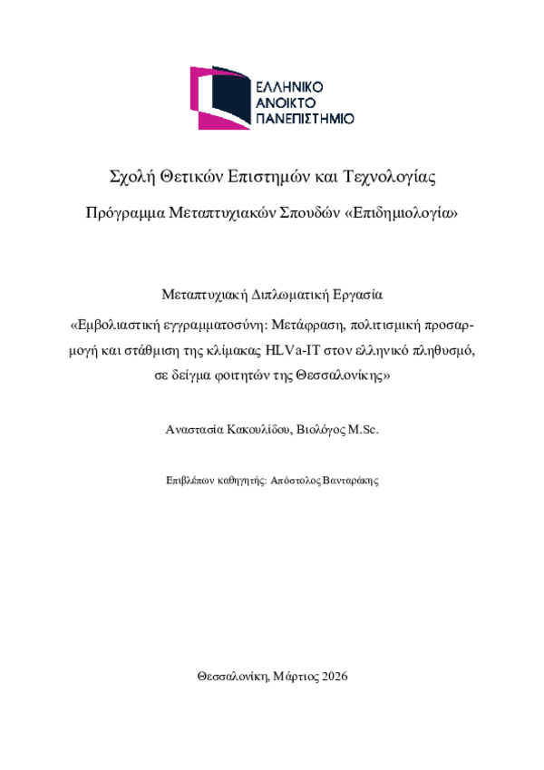 Vaccine Literacy: Translation, Cultural Adaptation And Validation of HLVa-IT scale in Greek population, in a sample of Thessaloniki Universities’ students [Αγγλική]