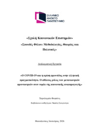 Περίληψη (Abstract): Η παρούσα διπλωματική εργασία εξετάζει τον αντίκτυπο που είχε η πανδημία στην κρίση φροντίδας της ελληνικής πραγματικότητας. Ιδαίτερα μελετά τον αθέατο, αλλά κομβικό ρόλο τον οποίο διαδραμάτισαν οι μετανάστριες φροντίστριες στον τομέα της κοινωνικής αναπαραγωγής. Ο COVID-19 υπήρξε σημαντικότατος καταλύτης που φώτισε και ενίσχυσε τις υφιστάμενες ανισότητες φύλου, φυλής, τάξης, εθνικότητας. Μάλιστα,...