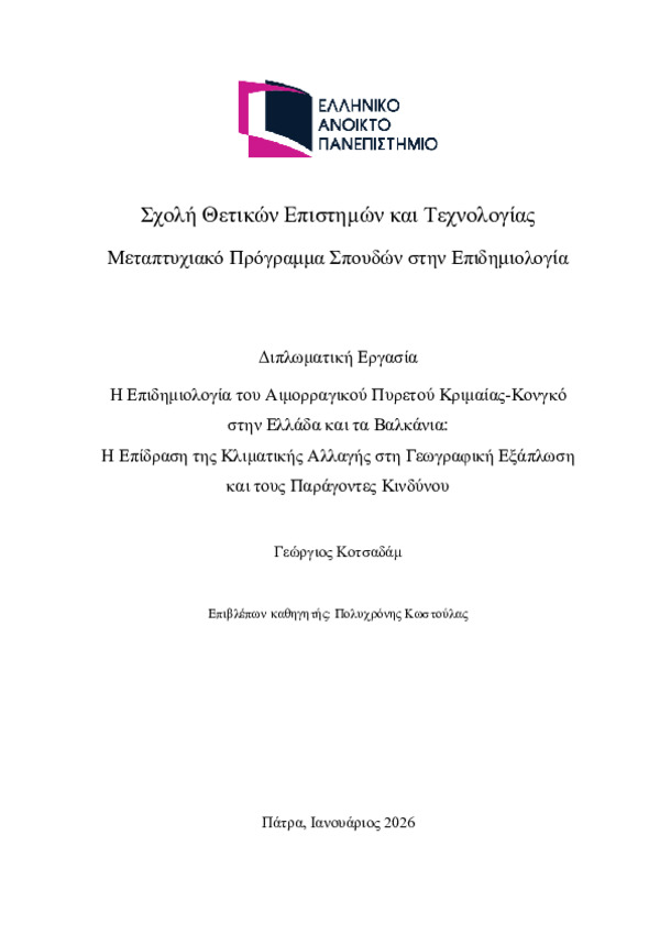 Περίληψη (Abstract): Ο αιμορραγικός πυρετός Κριμαίας-Κονγκό (CCHF) είναι η πιο διαδεδομένη, μεταδιδόμενη από φορείς, ιογενής νόσος, με πάνω από 100.000 μολύνσεις να καταγράφονται παγκοσμίως κάθε χρόνο. Προκαλείται από RNA-ιούς του γένους Orthonairovirus, της οικογένειας Nairoviridae, και μεταδίδεται από σκληρούς κρότωνες. Η νόσος προκαλεί αιμοστατική διαταραχή με μώλωπες, αιμορραγία, διάχυτη ενδοαγγειακή πήξη (DIC) κα...