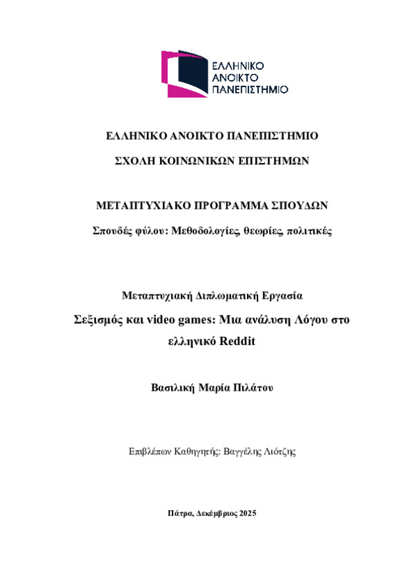 Περίληψη (Abstract): Η παρούσα διπλωματική εργασία ασχολείται με το πώς αναπαράγονται σεξιστικές αντιλήψεις μέσα στην ελληνική κοινότητα των gamers στο Reddit. Για να αναλυθεί αυτό το φαινόμενο, χρησιμοποιήθηκε η πολυτροπική κριτική ανάλυση Λόγου, ένα θεωρητικό πλαίσιο μέσα από το οποίο εξετάζεται η γλώσσα σε συνδυασμό με άλλα σημειωτικά στοιχεία, ώστε να εντοπιστούν οι έμφυλες στάσεις και οι αντιλήψεις των χρηστών. Η...