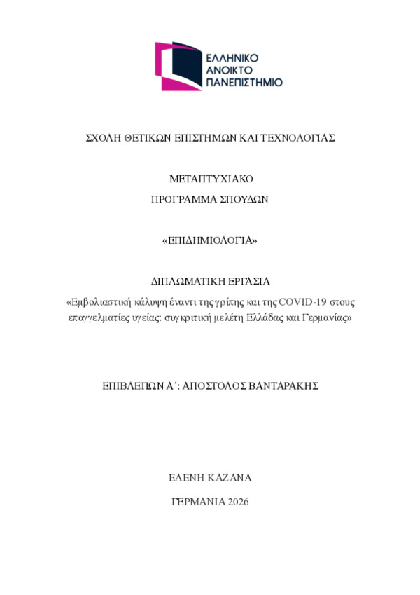 Περίληψη (Abstract): Το χαμηλό ποσοστό εμβολιασμού μεταξύ των επαγγελματιών υγείας αποτελεί σημαντικό ζήτημα δημόσιας υγείας, καθώς αυξάνει τον κίνδυνο μετάδοσης λοιμωδών νοσημάτων τόσο στους ίδιους όσο και σε ευάλωτους ασθενείς, με πιθανές σοβαρές κλινικές, κοινωνικές και οικονομικές συνέπειες. Παρά την επαρκή τεκμηρίωση της αποτελεσματικότητας και της ασφάλειας του εμβολιασμού κατά της γρίπης και της COVID-19, η εμβ...