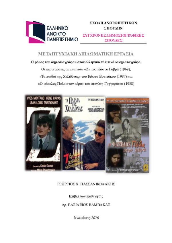 The role of the journalist in Greek political cinema. The cases of the films "Z" by Kostas Gavras (1969), "The Swallow's Children" by Kostas Vrettakos (1987) and "The Polk File in the Air" by Dionysis Grigoratos (1988) [Αγγλική]