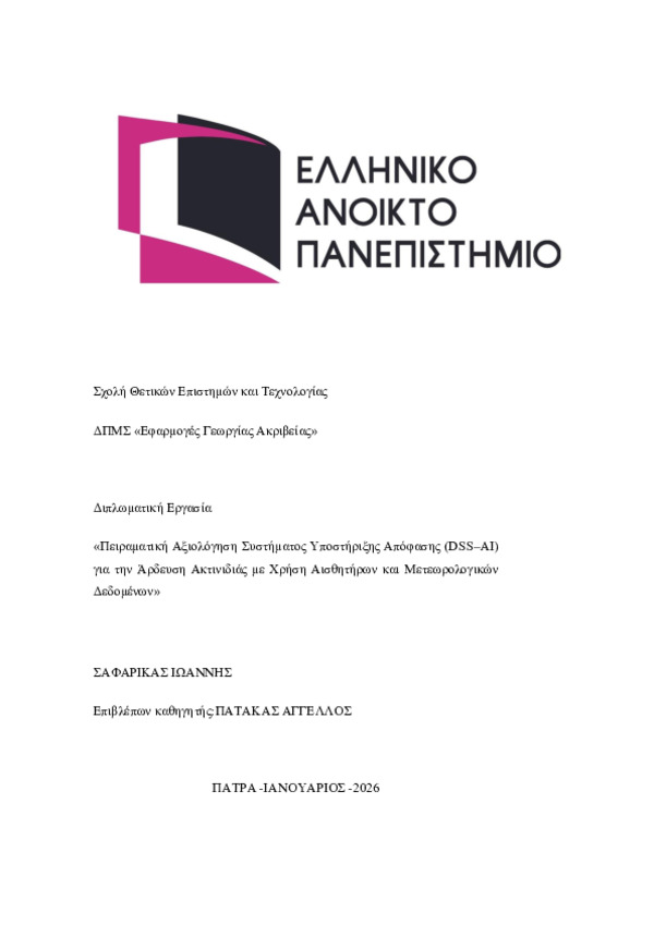 Περίληψη (Abstract): Η ορθολογική διαχείριση του αρδευτικού νερού αποτελεί κρίσιμο παράγοντα για τη βιωσιμότητα των δενδρωδών καλλιεργειών και ιδιαίτερα της ακτινιδιάς, η οποία χαρακτηρίζεται από υψηλές υδατικές απαιτήσεις και αυξημένη ευαισθησία σε υδατικό στρες. Οι επιπτώσεις της κλιματικής μεταβλητότητας, σε συνδυασμό με τη μείωση της διαθεσιμότητας υδατικών πόρων, καθιστούν αναγκαία την υιοθέτηση σύγχρονων εργαλεί...
