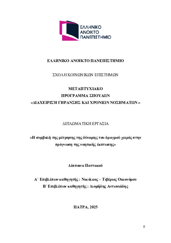 Περίληψη (Abstract): Η γήρανση του πληθυσμού συνοδεύεται από αυξημένη επίπτωση της νοητικής έκπτωσης και της άνοιας, γεγονός που δημιουργεί σημαντικές προκλήσεις για τα συστήματα υγείας και τη δημόσια υγεία. Η ανάγκη για έγκαιρο εντοπισμό ατόμων αυξημένου κινδύνου έχει ενισχύσει το ενδιαφέρον για απλούς, αξιόπιστους και χαμηλού κόστους λειτουργικούς δείκτες. Η δύναμη του δραγμού χειρός έχει αναδειχθεί ως δείκτης της σ...