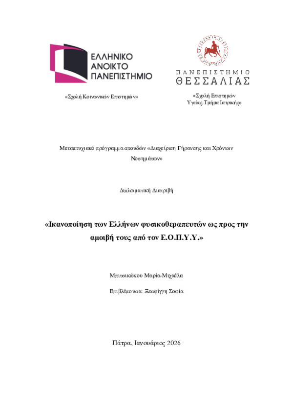 Περίληψη (Abstract): Εισαγωγή: Η φυσικοθεραπεία στην Ελλάδα έχει υποστεί σημαντικές αλλαγές, ειδικά από το 2011, όταν ιδρύθηκε ο Ε.Ο.Π.Υ.Υ.. Προηγούμενες μελέτες δείχνουν ότι πολλοί φυσικοθεραπευτές αισθάνονται ότι η αμοιβή τους δεν αντικατοπτρίζει την παραγωγικότητά τους ή την ποιότητα της φροντίδας που παρέχουν (Polyzos et al., 2014). Παρά τη σημασία της φυσικοθεραπείας στην πρωτοβάθμια φροντίδα υγείας, υπάρχει αυξα...