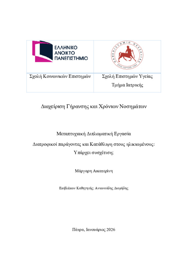 Περίληψη (Abstract): Η γήρανση του πληθυσμού αποτελεί ένα παγκόσμιο και διαρκώς εντεινόμενο φαινόμενο, το οποίο συνοδεύεται από σημαντικές προκλήσεις για τη δημόσια υγεία με την αυξημένη συχνότητα εμφάνισης καταθλιπτικών συμπτωμάτων να κατέχει ιδιαίτερη θέση. Πλήθος παραγόντων, όπως η παρουσία χρόνιων νοσημάτων, η λειτουργική έκπτωση, η κοινωνική απομόνωση, το φύλο, αλλά και το κοινωνικοοικονομικό υπόβαθρο, συχνά δρου...