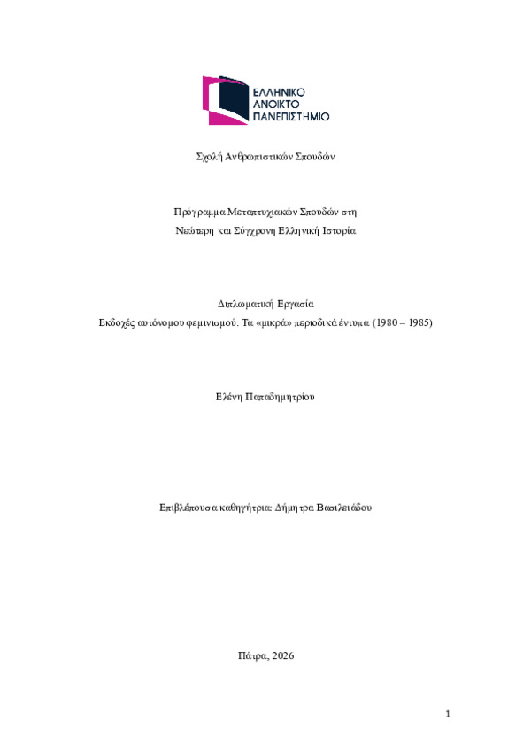 Περίληψη (Abstract): Η παρούσα διπλωματική εργασία διερευνά εκδοχές του αυτόνομου φεμινισμού κατά την περίοδο της Μεταπολίτευσης μέσα από την μελέτη τριών βραχύβιων περιοδικών εντύπων: Το Μήλο και το Φίδι από τη σκοπιά της Εύας, Σφίγγα και Γαία. Τα έντυπα αυτά, που εκδόθηκαν από ομάδες του αυτόνομου φεμινιστικού κινήματος αναλύονται όχι μόνο ως μέσα επικοινωνίας και διακίνησης ιδεών, αλλά και ως μορφές πολιτικής πράξη...