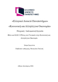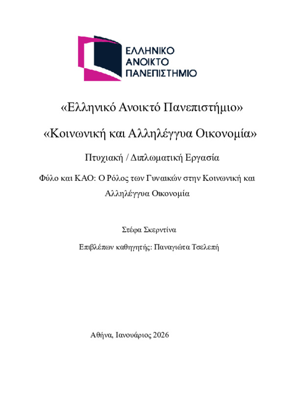 Περίληψη (Abstract): Η Διπλωματική αυτή εργασία εστιάζει στον ρόλο των γυναικών στην Κοινωνική και Αλληλέγγυα Οικονομία (ΚΑΟ) στην Ελλάδα, αναδεικνύοντας πως οι γυναίκες συμβάλλουν ενεργά στη διαμόρφωση των αξιών και των πρακτικών αυτών των πρωτοβουλιών. Βασίζεται στη φεμινιστική πολιτική οικονομία και τις θεωρείες της φροντίδας, συνδυάζοντας ιστορική και ποιοτική εμπειρική έρευνα μέσω συνεντεύξεων με γυναίκες συμμετέ...