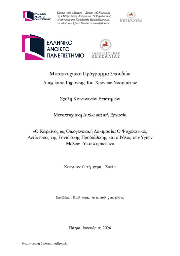 Ο καρκίνος δεν αφορά αποκλειστικά το άτομο που διαγιγνώσκεται, αλλά επηρεάζει δυναμικά το σύνολο του οικογενειακού πλαισίου, ενεργοποιώντας πολύπλοκες ψυχοκοινωνικές διεργασίες, ιδιαίτερα στις περιπτώσεις όπου υφίσταται γονιδιακή προδιάθεση. Η παρούσα μεταπτυχιακή διατριβή επικεντρώνεται στον ψυχολογικό, συναισθηματικό και φροντιστικό ρόλο που αναλαμβάνουν τα υγιή μέλη της οικογένειας, κ...