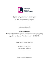 Περίληψη (Abstract): Η παρούσα μελέτη προβαίνει σε συγκριτική ανάλυση εννέα παραγωγών των έργων του Giuseppe Verdi Rigoletto, Il Trovatore και La Traviata, οι οποίες παρήχθησαν μεταξύ 1965 και 1985. Στόχος της εργασίας είναι η ανάλυση των σκηνοθετικών προσεγγίσεων σε συνάρτηση με τα χαρακτηριστικά των διαφόρων μορφών της βίντεο-όπερας, οι οποίες, κατά περίπτωση, διαμόρφωσαν τη μεταφορά της σκηνικής...
