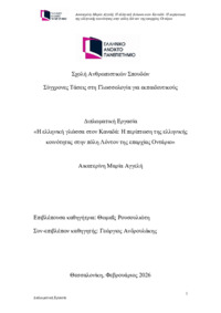 Περίληψη (Abstract): Στην παρούσα έρευνα εξετάζεται η χρήση και η διατήρηση της ελληνικής γλώσσας ως γλώσσα κληρονομιάς, μέσα από τρεις διαδοχικές γενιές μεταναστών, στην ελληνική κοινότητα του Λόντον στο Οντάριο του Καναδά. Τα ερευνητικά ερωτήματα αφορούν τη διερεύνηση των τρόπων διατήρησης και μετάδοσης της ελληνικής γλώσσας στην κοινότητα αυτή μέσω της οικογένειας, του σχολείου και της Κοινότητας, καθώς και τις στρ...