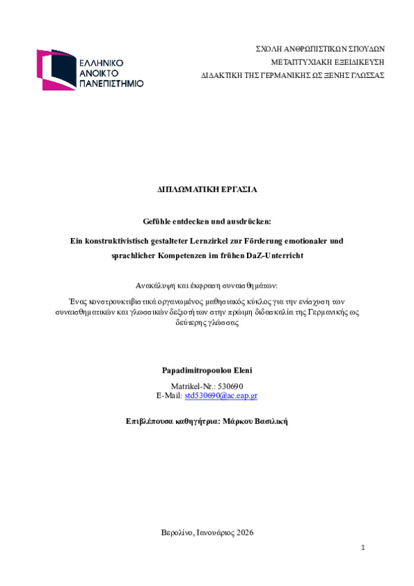 Ανακάλυψη και έκφραση συναισθημάτων: Ένας κονστρουκτιβιστικά οργανωμένος μαθησιακός κύκλος για την ενίσχυση των συναισθηματικών και γλωσσικών δεξιοτήτων στην πρώιμη διδασκαλία της Γερμανικής ως δεύτερης γλώσσας [Ελληνική]