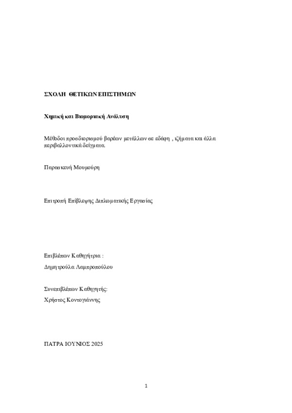 Περίληψη (Abstract): ΠΕΡΙΛΗΨΗ Τα βαρέα μέταλλα αποτελούν μια από της σημαντικότερες πηγές τοξικών ρύπων στο περιβάλλον επηρεάζοντας κυρίως τα εδάφη και τα ιζήματα μέσων βροχοπτώσεων και άλλων ανθρωπογενών δραστηριοτήτων,μεταφέρονται στο θαλάσσιο περιβάλλον και εισέρχονται στην τροφική αλυσίδα φυτών και ζωών.Η παρουσια τουσ σε συγκεντρωσεις που υπερβαίνουν τα φυσιολογικά όρια έχει αποδειχθεί σε μείζον περιβ...