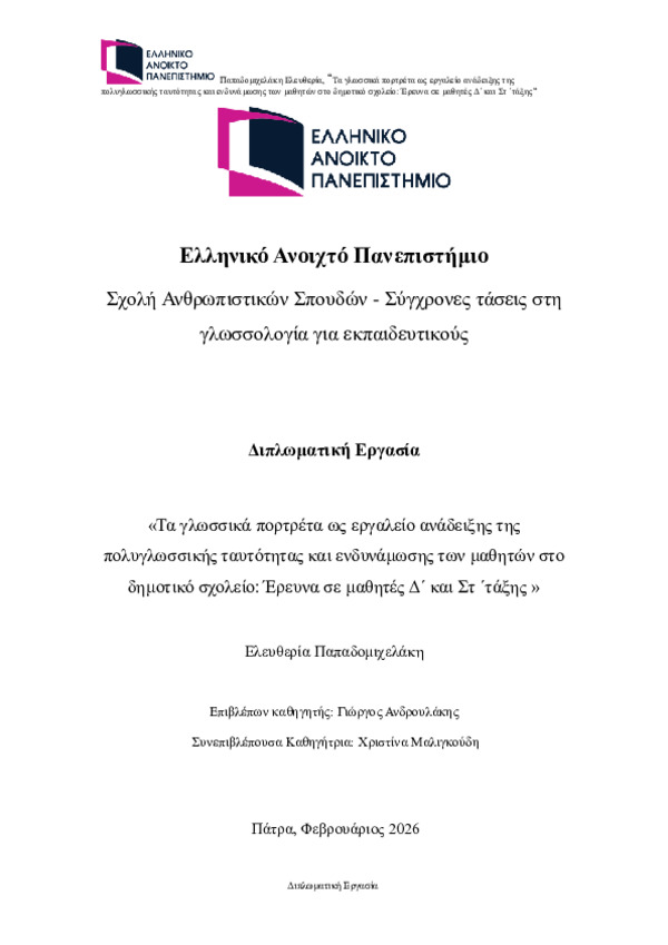 Περίληψη (Abstract): Το άρθρο εξετάζει τη χρήση των γλωσσικών πορτρέτων ως παιδαγωγικό εργαλείο για την ενίσχυση της πολυγλωσσικής ταυτότητας και την ενδυνάμωση των μαθητών σε πολυπολιτισμικά εκπαιδευτικά περιβάλλοντα. Τα γλωσσικά πορτρέτα αποτελούν οπτικές αναπαραστάσεις των γλωσσών που χρησιμοποιούν ή γνωρίζουν τα άτομα, αποτυπώνοντας το προσωπικό γλωσσικό τους ταξίδι και ενισχύοντας τη μεταγλωσσική τους επίγνωση. Η...