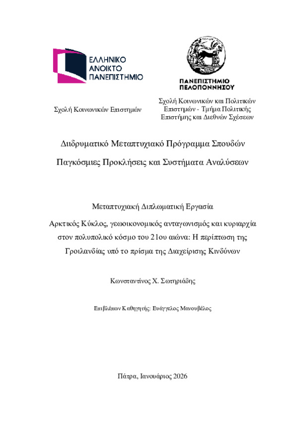 Περίληψη (Abstract): Στην παρούσα εργασία εξετάζεται η παγκόσμια πρόκληση της γεωοικονομικής αντιπαράθεσης στην Αρκτική, εστιάζοντας στα συμφέροντα της ΕΕ στη Γροιλανδία, σε ένα πλαίσιο αυξανόμενων γεωπολιτικών εντάσεων, εντεινόμενου στρατηγικού ανταγωνισμού και επιταχυνόμενων περιβαλλοντικών μεταβολών. Η Αρκτική αναδεικνύεται σε περιοχή αυξανόμενης γεωστρατηγικής σημασίας, όπου συγκλίνουν οι στρατιωτικές, πολιτικές κ...