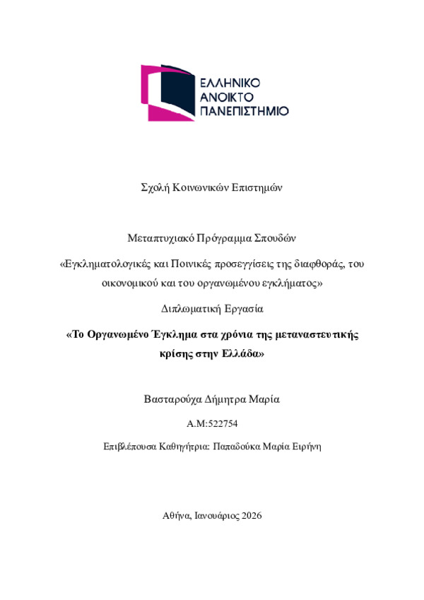 Περίληψη (Abstract): Η παρούσα διπλωματική εργασία εξετάζει το φαινόμενο του οργανωμένου εγκλήματος στην Ελλάδα κατά την περίοδο 2015–2024, υπό το πρίσμα της όξυνσης της μεταναστευτικής κρίσης, με κεντρικό στόχο τη διερεύνηση της επιρροής και της ενδεχόμενης σύνδεσης που μπορεί να αναπτύσσεται μεταξύ οργανωμένου εγκλήματος και μεταναστευτικών πληθυσμών. Η ανάλυση εστιάζει στην κοινωνική οργάνωση του οργανωμένου εγκλήμ...