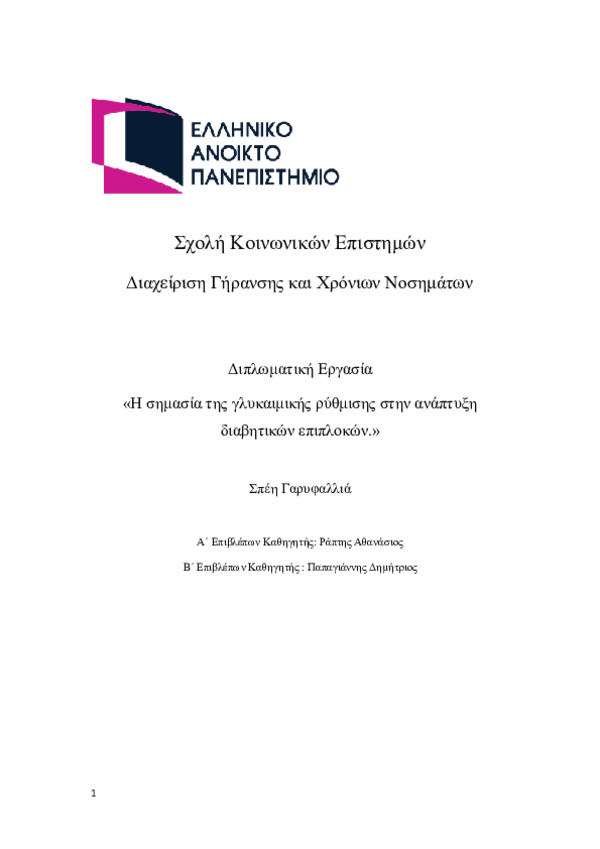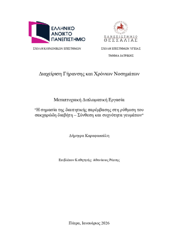 Περίληψη (Abstract): Ο σακχαρώδης διαβήτης αποτελεί ένα από τα πλέον σημαντικά και ταχέως αυξανόμενα προβλήματα δημόσιας υγείας παγκοσμίως, με ιδιαίτερη επίπτωση στον γηράσκοντα πληθυσμό. Η αύξηση του προσδόκιμου ζωής έχει οδηγήσει σε μεγαλύτερη συχνότητα εμφάνισης χρόνιων μεταβολικών νοσημάτων, όπως ο σακχαρώδης διαβήτης τύπου 2, επηρεάζοντας αρνητικά την ποιότητα ζωής και τη λειτουργική ικανότητα των ατόμων.