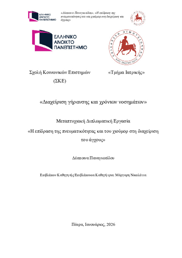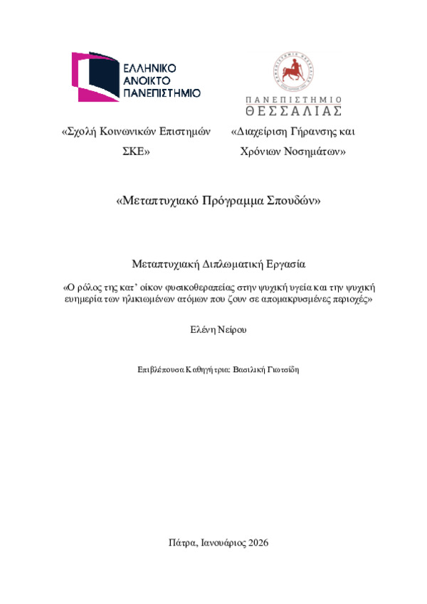 Περίληψη (Abstract): Η γήρανση αποτελεί μια φυσιολογική φάση της ζωής, η οποία συνοδεύεται από αλλαγές που συχνά δυσχεραίνουν την αυτονομία και την ποιότητα ζωής των ηλικιωμένων. Η προώθηση της ενεργούς γήρανσης, με βασικό άξονα τη συστηματική άσκηση και τη δραστηριοποίηση στην καθημερινότητα, συμβάλλει ουσιαστικά στη βελτίωση της ψυχικής υγείας και της ευημερίας τους. Ωστόσο, λόγω της ευαλωτότητας ...
