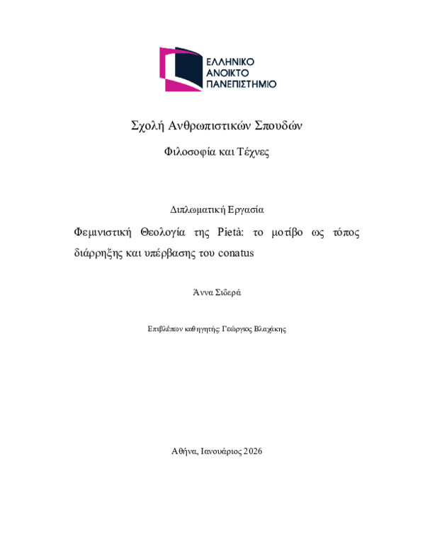 Περίληψη (Abstract): Η παρούσα διπλωματική διερευνά τη Pieta ως εικονιστικό μοτίβο που συμπυκνώνει, με εννοιολογική πυκνότητα, τη συνύπαρξη θανάτου, φροντίδας και σχέσης. Αφετηρία αποτελεί η κλασική εικονογραφική καθιέρωση του τύπου και η κορύφωση του στο έργο Pietà του Μιχαήλ Αγγέλου, όπου το νεκρό σώμα δεν λειτουργεί μόνο ως θεολογικό σημείο, αλλά ως υλικό βάρος που εγκαθίσταται στη σφαίρα της θέασης ως εμπειρ...