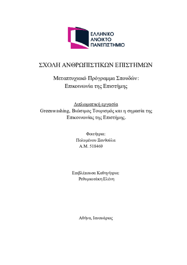 Περίληψη (Abstract): Η παρούσα εργασία εστιάζει στην πολυεπίπεδη ανάλυση του φαινομένου του Greenwashing στο πεδίο του Βιώσιμου Τουρισμού, αναδεικνύοντας τον ουσιώδη ρόλο της επικοινωνίας της επιστήμης στην προώθηση της διαφάνειας, της λογοδοσίας και της αυθεντικής περιβαλλοντικής υπευθυνότητας. Καθώς το ενδιαφέρον για τη βιωσιμότητα εντείνεται παγκοσμίως, ο τουριστικός τομέας έχει ενσωματώσει σε μεγάλο βαθμό ‘πράσινε...