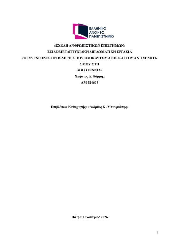 Περίληψη (Abstract): Η μεταπτυχιακή διπλωματική εργασία πραγματεύεται τις σύγχρονες προσλήψεις του Ολοκαυτώματος και του αντισημιτισμού στη λογοτεχνία. Ο Μισέλ Φάις με την «Αυτοβιογραφία ενός βιβλίου», ο Νίκος Δαββέτας με την «Η Εβραία νύφη» και η Ρέα Γαλανάκη με τις«Φωτιές του Ιούδα, στάχτες του Οιδίποδα» μας ξεναγούν από τη συλλογική στην οικογενειακή μνήμη, στα τραύματα που αυτή δημιουργεί διαγενεακά και στις προκα...