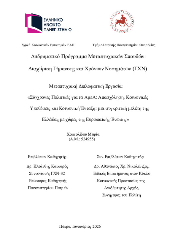 Περίληψη (Abstract): Η παρούσα εργασία με τίτλο ''Το ασφαλιστικό σύστημα στην Ελλάδα και στην Ευρώπη: Μια συγκριτική ανάλυση'' διερευνά την κοινωνική ασφάλιση χωρών της Ευρώπης, η οποία λειτουργεί ως θεμελιώδης θεσμός του κράτους με στόχο τη θωράκιση του πληθυσμού έναντι βασικών κοινωνικοοικονομικών κινδύνων, όπως η γήρανση, η αναπηρία, η ανεργία και η ασθένεια. Η θεωρητική προσέγγιση της μελέτης εδράζεται στα δύο κυρ...