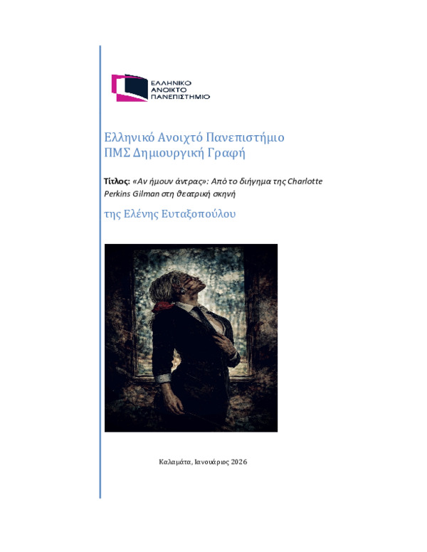 Περίληψη (Abstract): Η παρούσα εργασία εξετάζει το διήγημα If I Were a Man της Charlotte Anna Perkins Gilman μέσα από το πρίσμα της φεμινιστικής λογοτεχνικής κριτικής, ενσωματώνοντας ιστορικές, θεωρητικές και σκηνικές προσεγγίσεις. Στις αρχικές ενότητες παρουσιάζονται το βιογραφικό και το έργο της Gilman, με έμφαση στη συμβολή της στη φεμινιστική σκέψη των αρχών του 20ού αιώνα και στη σχέση της λογοτεχνικής παραγωγής ...