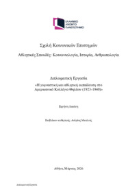Περίληψη (Abstract): Αντικείμενο της παρούσας εργασίας είναι η μελέτη της γυμναστικής και αθλητικής εκπαίδευσης στο Αμερικανικό Κολλέγιο Θηλέων κατά τη μεσοπολεμική περίοδο (1923-1940), όπως αυτή διαμορφώθηκε μετά τη μετεγκατάσταση του ιδρύματος από τη Σμύρνη στο Φάληρο. Σκοπός της έρευνας είναι η εξέταση της γυμναστικής και αθλητικής εκπαίδευσης των μαθητριών κατά την περίοδο 1923-1940, η διερεύνηση της σχέσης αυτής ...