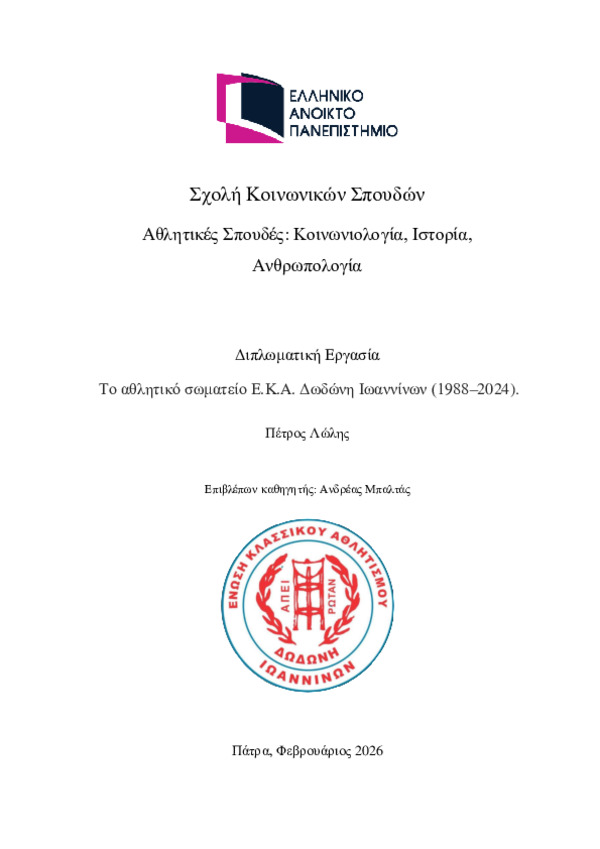 Περίληψη (Abstract): Η παρούσα μεταπτυχιακή εργασία εξετάζει την κοινωνική ιστορία και τα κοινωνικά χαρακτηριστικά του αθλητικού σωματείου Ε.Κ.Α. Δωδώνη Ιωαννίνων, από την ίδρυσή του το 1988 έως το 2024 και αποσκοπεί στην ανάλυση του ρόλου του ως σωματείου κλασικού αθλητισμού και ως τοπικού κοινωνικού θεσμού. Ειδικότερα, ερευνάται η κοινωνική φυσιογνωμία και η λειτουργία του συλλόγου, μέσα από την ανάδειξη των διαδικα...