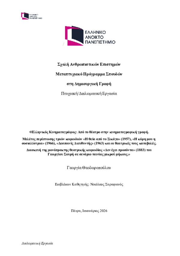 Greek Cinema: From theater to Cinematography. Cases studies of threee comedies: "The Auntie from Chicago" (1957), "My Doughter the Socialist" (1966), "Miss Director" (1963) and the theatrical performances. Adaptation of the one-act satire "He has no Qualifications" (1883) by Georgios Souris into a short film script. [Αγγλική]