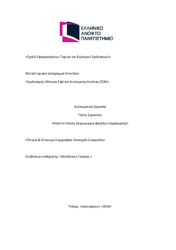 Περίληψη (Abstract): Η παρούσα εργασία αναφέρεται στη διερεύνηση δημιουργίας 3d animation που έχει ως στόχο να προάγει την αξία των παραμυθιών και να καλλιεργήσει στα παιδιά την αγάπη για το παιδικό βιβλίο, το οποίο αποτελεί το περιεχόμενο ενός ολοκληρωμένου φακέλου παραγωγής 3d animation. Πάντα στο νηπιαγωγείο υπάρχει μια αφορμή για να ξεκινήσει μία δραστηριότητα. Συχνά η αφορμή αυτή προέρχετα...