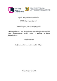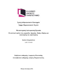 Περίληψη (Abstract): Η παρούσα διπλωματική εργασία εξετάζει τη Μικρογραφική Ζωφόρο του Στόλου από τη Δυτική Οικία του Ακρωτηρίου Θήρας, με στόχο τη συνολική στυλιστική, εικονογραφική και τοπογραφική της ανάλυση και τη διερεύνηση του βαθμού ρεαλιστικής απόδοσης του φυσικού και ανθρωπογενούς περιβάλλοντος. Η μελέτη εστιάζει στη δομή της αφήγησης, στα αρχιτεκτονικά χαρακτηριστικά των απεικονιζόμενων οικισμών, στο τοπίο κ...