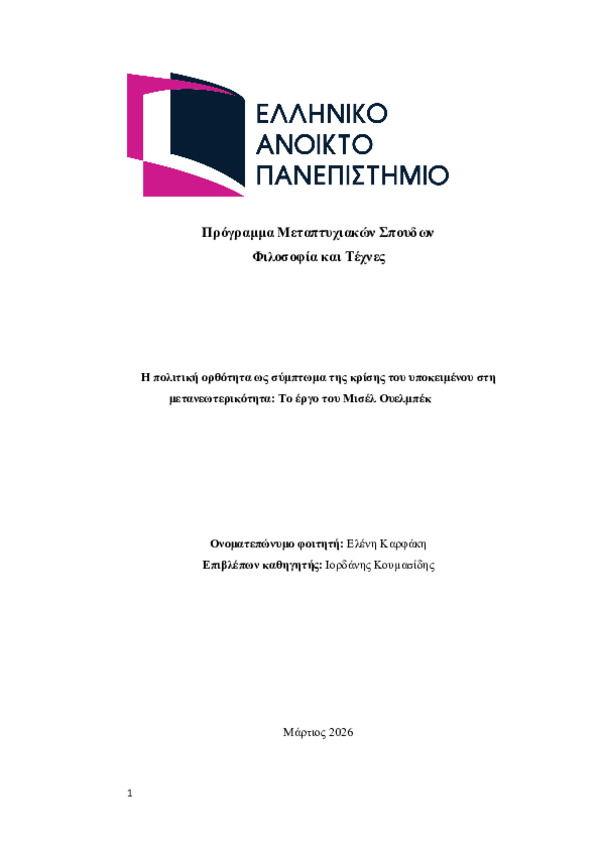 Περίληψη (Abstract): Η παρούσα διπλωματική εργασία εξετάζει την πολιτική ορθότητα ως σύμπτωμα της κρίσης του υποκειμένου στη μετανεωτερικότητα, με κεντρικό σημείο αναφοράς το μυθοπλαστικό έργο του Μισέλ Ουελμπέκ. Υποστηρίζεται ότι η πολιτική ορθότητα δεν αποτελεί απλώς σύνολο ηθικών ή γλωσσικών κανόνων, αλλά ένα καθεστώς λόγου που συμπίπτει ιστορικά με την αποδυνάμωση της υποκειμενικότητας, την κρίση της αφήγησης και ...