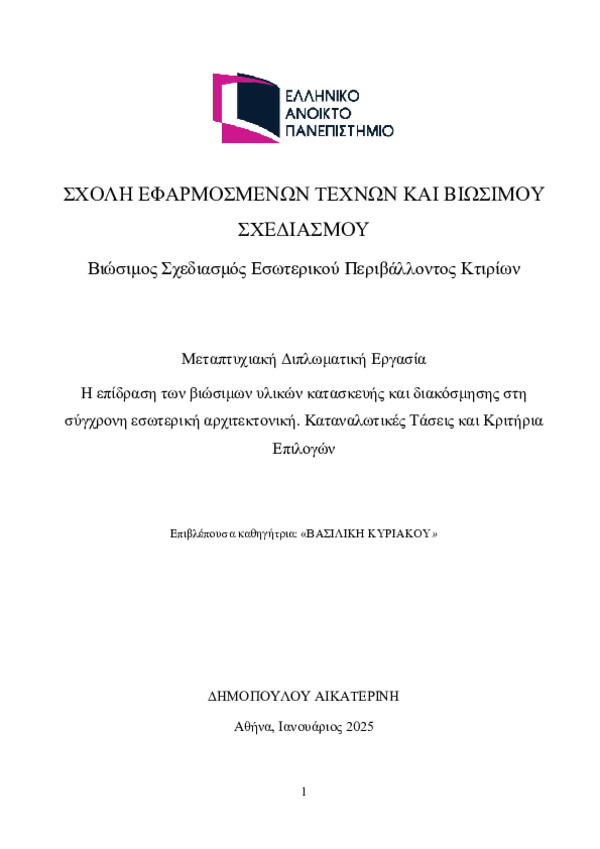 The Impact of Sustainable Construction and Decoration Materials on Contemporary Interior Architecture. Consumer Trends and Selection [Αγγλική]