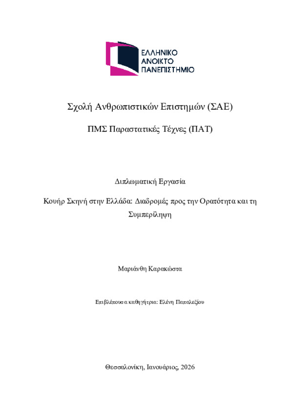 Περίληψη (Abstract): Η παρούσα εργασία επιχειρεί να προσεγγίσει κουήρ παραστάσεις στη σύγχρονη ελληνική σκηνή, διερευνώντας τις αισθητικές και πολιτικές τους διαστάσεις. Αντικείμενό της αποτελεί η μελέτη των τρόπων με τους οποίους το κουήρ θέατρο λειτουργεί ως χώρος καλλιτεχνικής έκφρασης, αντίστασης και κοινωνικού αναστοχασμού, προβάλλοντας το σώμα και τη διαφορετικότητα ως πεδία διεκδίκησης ορατότητας και επαναδιαπρ...