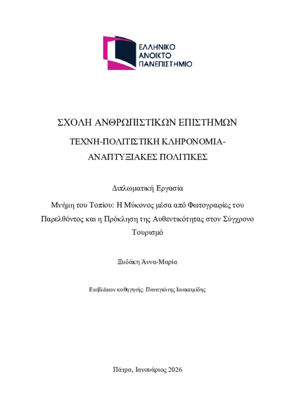 Περίληψη (Abstract): Η παρούσα διπλωματική εργασία εξετάζει τη Μύκονο ως τόπο πολιτισμικής μνήμης και ταυτόχρονα ως παγκόσμιο τουριστικό brand, εστιάζοντας στον ρόλο της φωτογραφίας στη διαμόρφωση, τη διατήρηση και τον μετασχηματισμό της αυθεντικότητας του τόπου. Μέσα από την ανάλυση φωτογραφιών του παρελθόντος σε αντιπαραβολή με τις σύγχρονες οπτικές αναπαραστάσεις της Μυκόνου στα μέσα κοινωνικής δικτύωσης και στη δι...