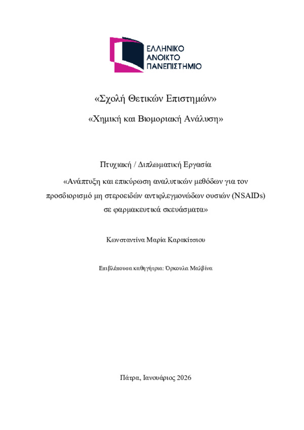 Περίληψη (Abstract): Τα μη στεροειδή αντιφλεγμονώδη φάρμακα (NSAIDs) αποτελούν μία από τις πλέον διαδεδομένες κατηγορίες φαρμακευτικών ουσιών, με ευρεία χρήση στην αντιμετώπιση του πόνου, της φλεγμονής και του πυρετού. Η εκτεταμένη κατανάλωσή τους, τόσο σε συνταγογραφούμενα όσο και σε μη συνταγογραφούμενα φαρμακευτικά προϊόντα, καθιστά επιτακτική την ανάγκη για αξιόπιστο ποιοτικό έλεγχο, προκειμένου να διασφαλίζεται η...