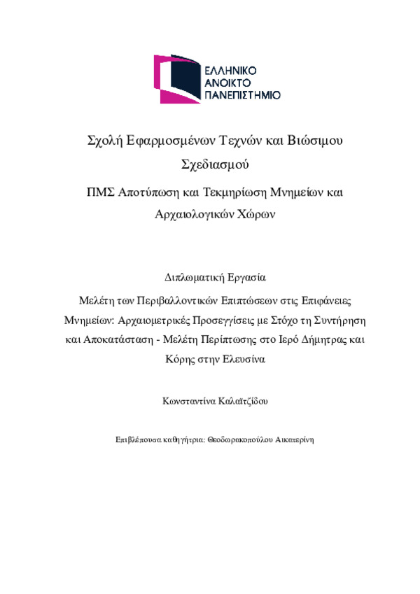 Study of the Environmental Impacts on Monument Surfaces: Archaeometric Approaches Aimed at Conservation and Restoration – Case Study on the Sanctuary of Demeter and Kore at Eleusis [Αγγλική]