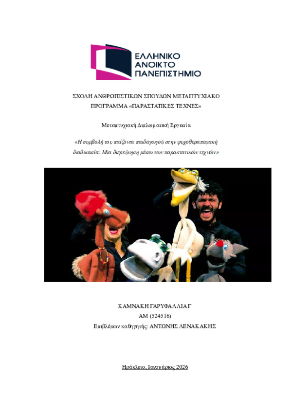 Περίληψη (Abstract): Η παρούσα εργασία διευρευνά το ρόλο του παίζοντα παιδαγωγού στη σύγχρονη παιδαγωγική και θεραπευτική πράξη, εστιάζοντας στη δυναμική σύγκλιση παιδαγωγικής και ψυχοθεραπείας μέσω των παραστατικών τεχνών. Βασικός άξονας της ανάλυσης απότελεί το παιχνίδι ως μέσω βιωματικού, συμβολικού και μετασχηματιστικού μέσου μάθησης και αυτογνωσίας, ιδιαίτερα στο πλαίσιο της εκπαίδευσης και της ομαδικής εργασίας ...
