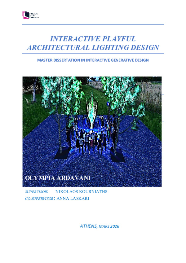 Περίληψη (Abstract): INTERACTIVE PLAYFUL ARCHITECTURAL LIGHTING DESIGN ABSTRACTThis thesis aims to demonstrate the potential of interactive, playful architectural lighting, not as a mere decorative intervention in the built environment, but as basic tool of human-centered design and an attempt to transform space from static to dynamic, by redefining people's relationship with it. Human centric lighting supports both t...