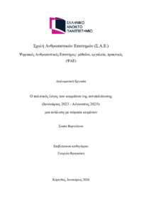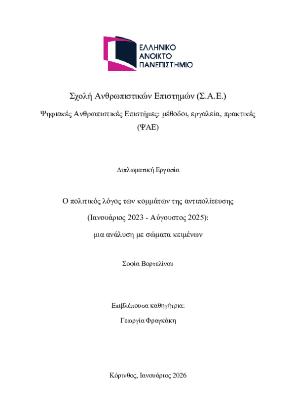 Περίληψη (Abstract): Η παρούσα εργασία επιχειρεί τη συστηματική ανάλυση του πολιτικού λόγου των κομμάτων της ελληνικής αντιπολίτευσης για το χρονικό διάστημα από τον Ιανουάριο του 2023 έως και τον Αύγουστο του 2025. Η έρευνα αξιοποιεί μεθόδους ανάλυσης σωμάτων κειμένων και εντάσσει τα ποσοτικά ευρήματα σε ένα ευρύτερο πλαίσιο μελέτης της ιδεολογίας.Τα δεδομένα της έρευνας αποτελούνται από δελτία τύπου και επίσημες ανα...