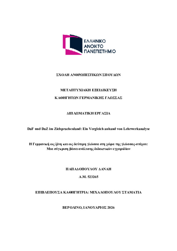 Περίληψη (Abstract): Die vorliegende Masterarbeit untersucht die Unterschiede zwischen dem Unterricht Deutsch als Fremdsprache (DaF) und Deutsch als Zweitsprache (DaZ), wobei beide Kursarten im deutschsprachigen Raum stattfinden. Im ersten Teil werden zentrale Begriffe definiert und relevante theoretische Grundlagen dargestellt. Dabei wird insbesondere die Entwicklung der Fächer DaF und DaZ, der Stellenwert der G...