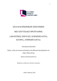 Περίληψη (Abstract): Η παρούσα διπλωματική εξετάζει τον ρόλο των δημοτικών προγραμμάτων άθλησης ως μορφών κοινωνικής πολιτικής και καθημερινής πρακτικής, με εμπειρική εστίαση στον Δήμο Νέας Ιωνίας. Σε ένα πυκνοκατοικημένο αστικό περιβάλλον με κοινωνική ετερογένεια και έντονη προσφυγική και ιστορική παράδοση συλλογικότητας, ο δημοτικός αθλητισμός δεν λειτουργεί αποκλειστικά ως παροχή φυσικής δραστηριότητας, αλλά και ως...