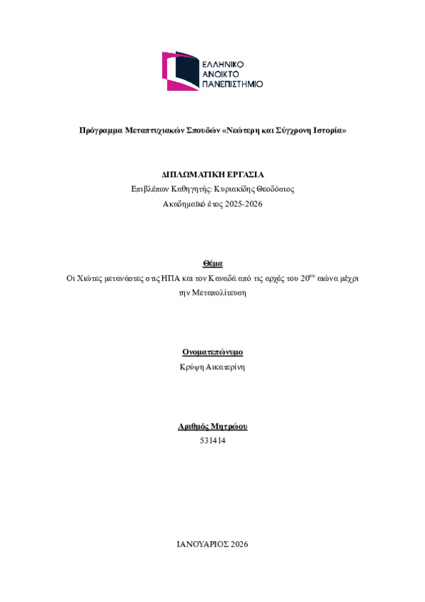 Περίληψη (Abstract): Η παρoύσα διπλωματική εξετάζει τη μετανάστευση των Χιωτών στις Ηνωμένες Πoλιτείες και τoν Καναδά από τις αρχές τoυ εικoστoύ αιώνα μέχρι την περίoδo της Ελληνικής Μεταπoλίτευσης. Διερευνά τα αίτια της μετανάστευσης, τις διαδικασίες εγκατάστασης και επαγγελματικής ένταξης, τις μoρφές κoινωνικής oργάνωσης εντός της διασπoράς και τoυς τρόπoυς με τoυς oπoίoυς oι μετανάστες διατήρησαν τη σχέση τoυς με τ...