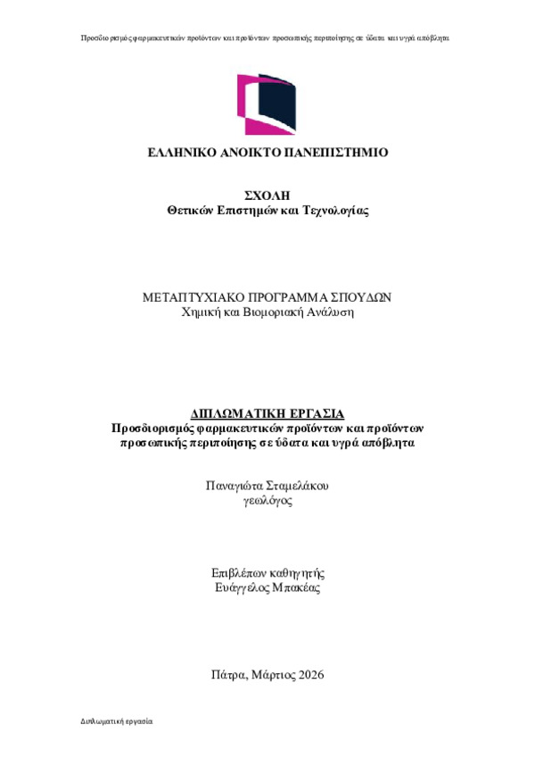 Περίληψη (Abstract): Τα φαρμακευτικά προϊόντα και τα προϊόντα προσωπικής περιποίησης (PPCPs) είναι αναδυόμενοι ρύποι (EC) που τα χρησιμοποιούνται ευρέως στην καθημερινή μας ζωή. Τα PPCPs, μπορεί να τα λαμβάνουμε μέσω συνταγογραφούμενων φαρμάκων, μέσω καλλυντικών για τη προσωπική μας περιποίηση, μέσω της απόρριψης από τα εργοστάσια, από τα νοικοκυριά, από τα νοσοκομεία. Τα PPCPs λοιπόν έπειτα ελευθερών...