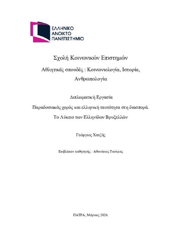 Περίληψη (Abstract): Η παρούσα διπλωματική εργασία εξετάζει τον ρόλο του Λυκείου των Ελληνίδων Βρυξελών (ΛΕΒ) στη συγκρότηση, διατήρηση και αναπαραγωγή της ελληνικής πολιτιστικής ταυτότητας στο πλαίσιο της ελληνικής διασποράς, με κεντρικό άξονα τον παραδοσιακό χορό. Στόχος της έρευνας ήταν η διερεύνηση της λειτουργίας του ΛΕΒ ως πολιτιστικού και κοινωνικού φορέα, καθώς και η κατανόηση του τρόπου με τον οποίο ο παραδοσ...