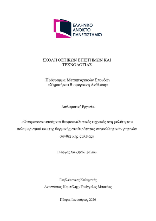 Περίληψη (Abstract): Η παρούσα διπλωματική εργασία έχει ως αντικείμενο την παρουσίαση και αξιολόγηση των φασματοσκοπικών και θερμοαναλυτικών τεχνικών που εφαρμόζονται για τη μελέτη των συγκολλητικών ρητινών στη βιομηχανία συνθετικής ξυλείας. Η ανάγκη για παραγωγή προϊόντων με βελτιωμένες μηχανικές αντοχές και μειωμένες εκπομπές φορμαλδεΰδης καθιστά απαραίτητη τη καλύτερη κατανόηση των μηχανισμών πολυμερισμού και της θ...