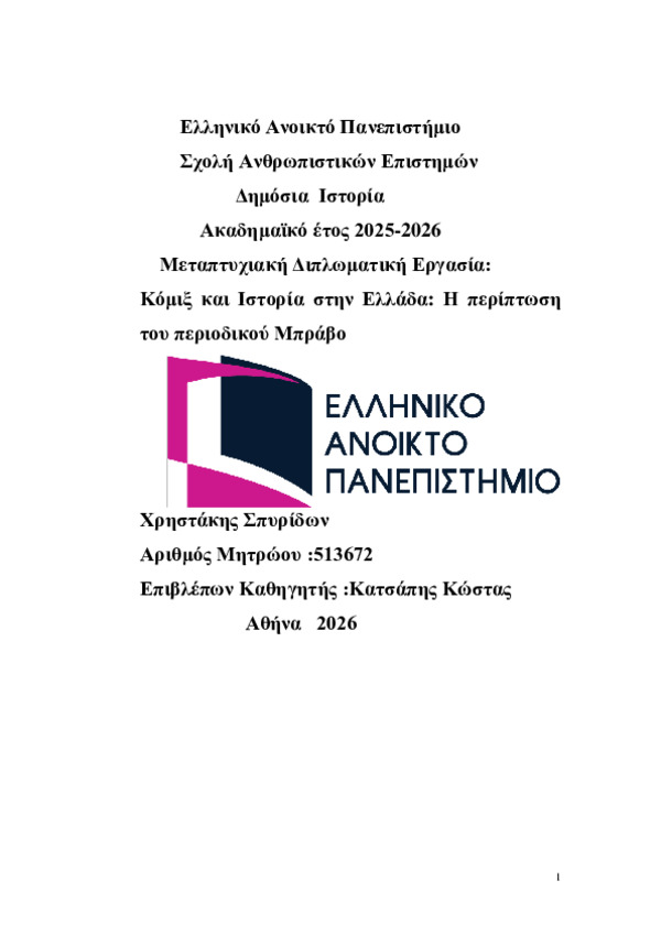 Περίληψη (Abstract): Η παρούσα διπλωματική εργασία εξετάζει την ιστορική εξέλιξη και την καλλιτεχνική διάσταση των ντραγκ σόου στην Ελλάδα, χαρτογραφώντας τη μετάβασή τους από το περιθώριο σε μια ευρέως αποδεκτή μορφή επιτελεστικής έκφρασης. Το ντραγκ προσεγγίζεται όχι μόνο ως μέσο ψυχαγωγίας, αλλά και ως ένα πολυσύνθετο κοινωνικοπολιτισμικό και καλλιτεχνικό φαινόμενο, άρρηκτα συνδεδεμένο με ζητήματα φύλου, ταυτότητας...