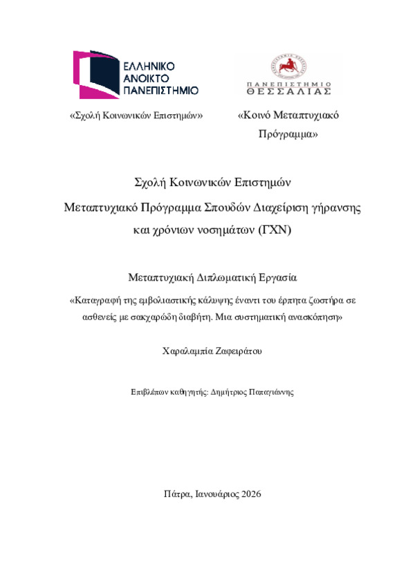 Περίληψη (Abstract): Μία από τις πιο σημαντικές χρόνιες μη μεταδοτικές νόσους σε παγκόσμιο επίπεδο, με ολοένα και αυξανόμενη επίπτωση και σημαντικές επιδράσεις στη δημόσια υγεία είναι ο σακχαρώδης διαβήτης. Η υπεργλυκαιμία, με συνοδές μεταβολικές, κυτταρικές και αγγειακές διαταραχές, επηρεάζουν την υγεία και την ποιότητα ζωής των ασθενών. Έτσι, η πρόληψη και η ενίσχυση της συνολικής υγείας των διαβητικών ασθενών, είνα...